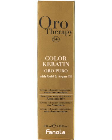 La coloration permanente Oro Puro est formulée sans ammoniaque et sans paraphénylènediamine, à base de Kératine, Or et huile d'Argan dans un tube de 100ml. Elle assure une couverture maximale des cheveux blancs et les rends extraordinairement brillants, souples, hydratés et protégés. Elle apporte des reflets avec une haute tenue du pigment et brillance et uniformité extrême de la couleur pour une longue durée.